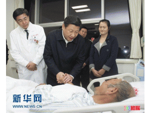 两天来,习近平一直关注着事故抢险工作,惦记着在事故中受到损失的群众。24日下午,习近平一抵达青岛,就在山东省委书记姜异康、省长郭树清陪同下,来到青岛大学附属医院黄岛分院,看望慰问伤员、医护人员和遇难者家属。他走进病房,先后来到受伤群众姜瑞芬、薛淑美、徐之泰、孙桂山病床前,同他们亲切握手,仔细查看伤情,鼓励他们配合治疗、安心养病。习近平同医疗专家代表一一握手,肯定他们关键时刻迅速行动、连续作战、不怕疲劳的救死扶伤精神,希望他们劳逸结合、科学调度、再接再厉,确保每个伤员都得到精心治疗。习近平在看望遇难者家属时,对他们亲属的不幸遇难表示哀悼,希望他们节哀制痛、树立生活信心,表示党和政府一定会尽最大努力安排好大家工作生活。他要求有关部门要一家一家把善后工作做细做实。