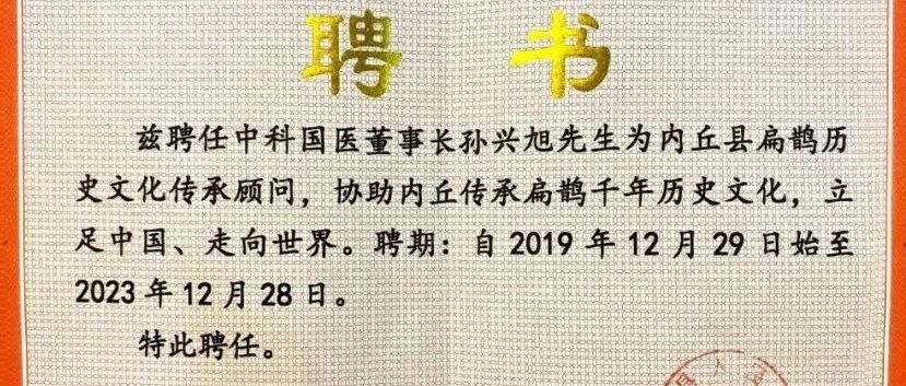 中科国医董事长孙兴旭先生以医祖扁鹊之乡内丘县荣誉市民的身份,凭借倾情打造《扁鹊传奇之巫影医踪》网络电影以及为传承、传播和弘扬扁鹊文化带来的内丘县地域历史人物品牌文化遗产影响力。自2019年12月29日起被河北省、邢台市、内丘县人民政府聘任为首位“扁鹊历史文化传承顾问”,协助内丘传承扁鹊千年历史文化,立足中国、走向世界。